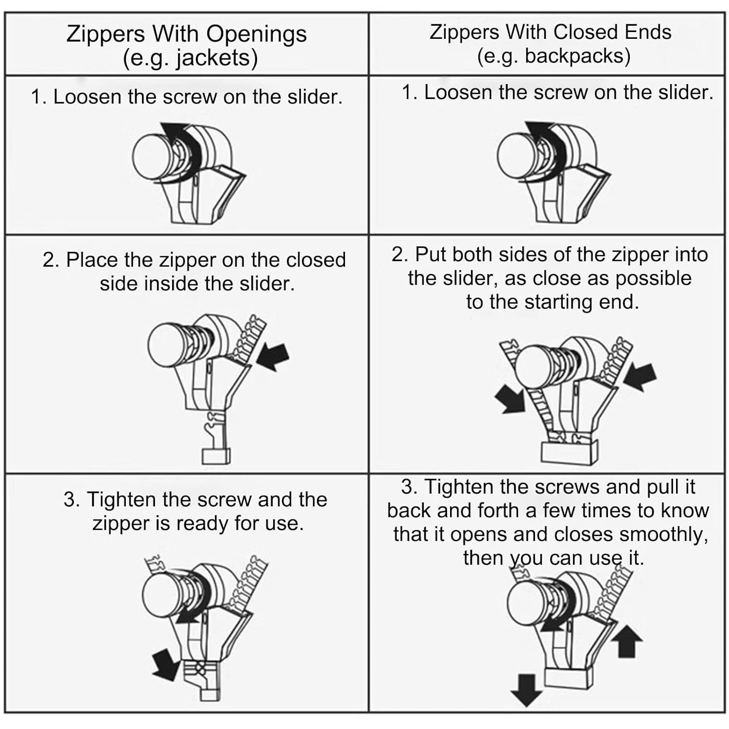 - How to use: Open zipper (such as jacket): 1. Loosen the screw on the slider, 2. Put the zipper on the closed side into the slider, 3. Tighten the screw and the zipper can be used as usual Closed zipper (such as backpack): 1. Loosen the screw on the slider, 2. Put the zippers on both sides into the slider, as close to the starting end as possible, 3. Tighten the screw, pull back and forth several times until the opening and closing are smooth and you can use it as usual